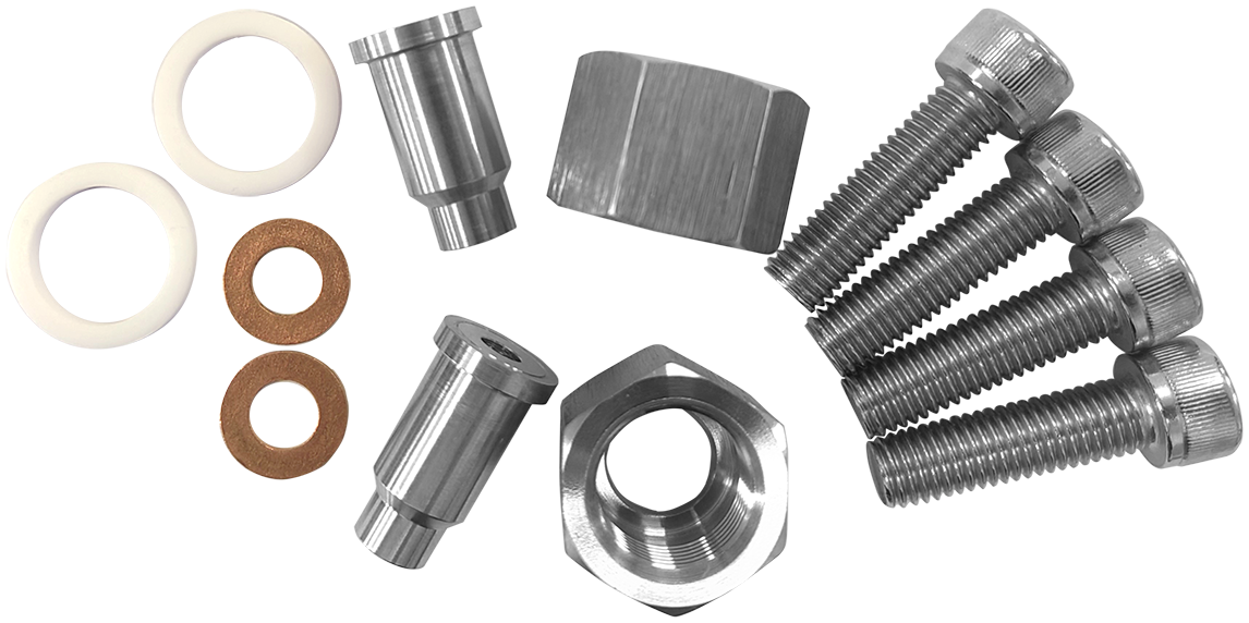 | Ниппель, нерж. сталь – 2 шт. Накидная гайка, нерж. сталь – 2 шт. Болт М10×35 DIN912 А2 – 4 шт. Медная прокладка 16,7×9×1,5 мм – 2 шт. Фторопластовая прокладка 24×18×2,5 мм – 2 шт. | Комплект для монтажа БВ-3хх и БВ-5хх №1 заказать | |