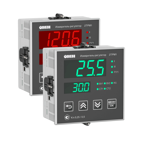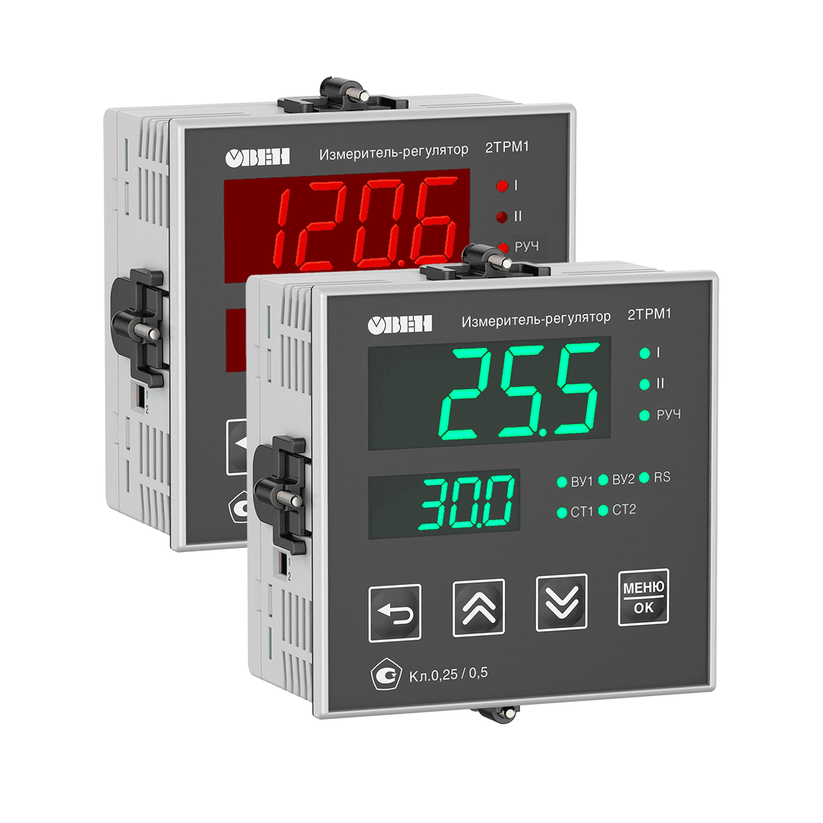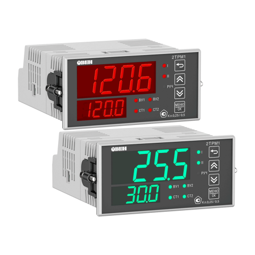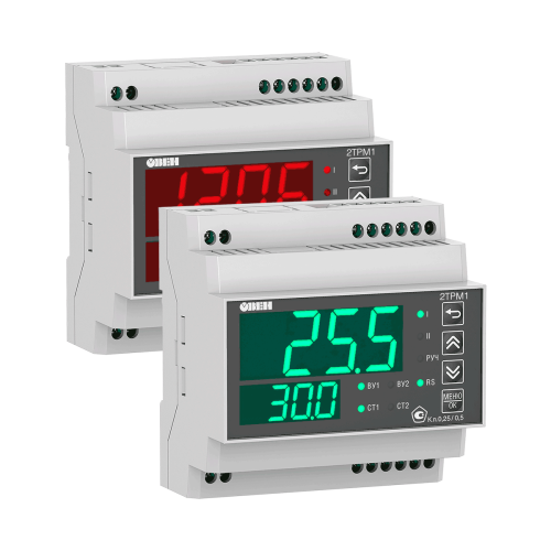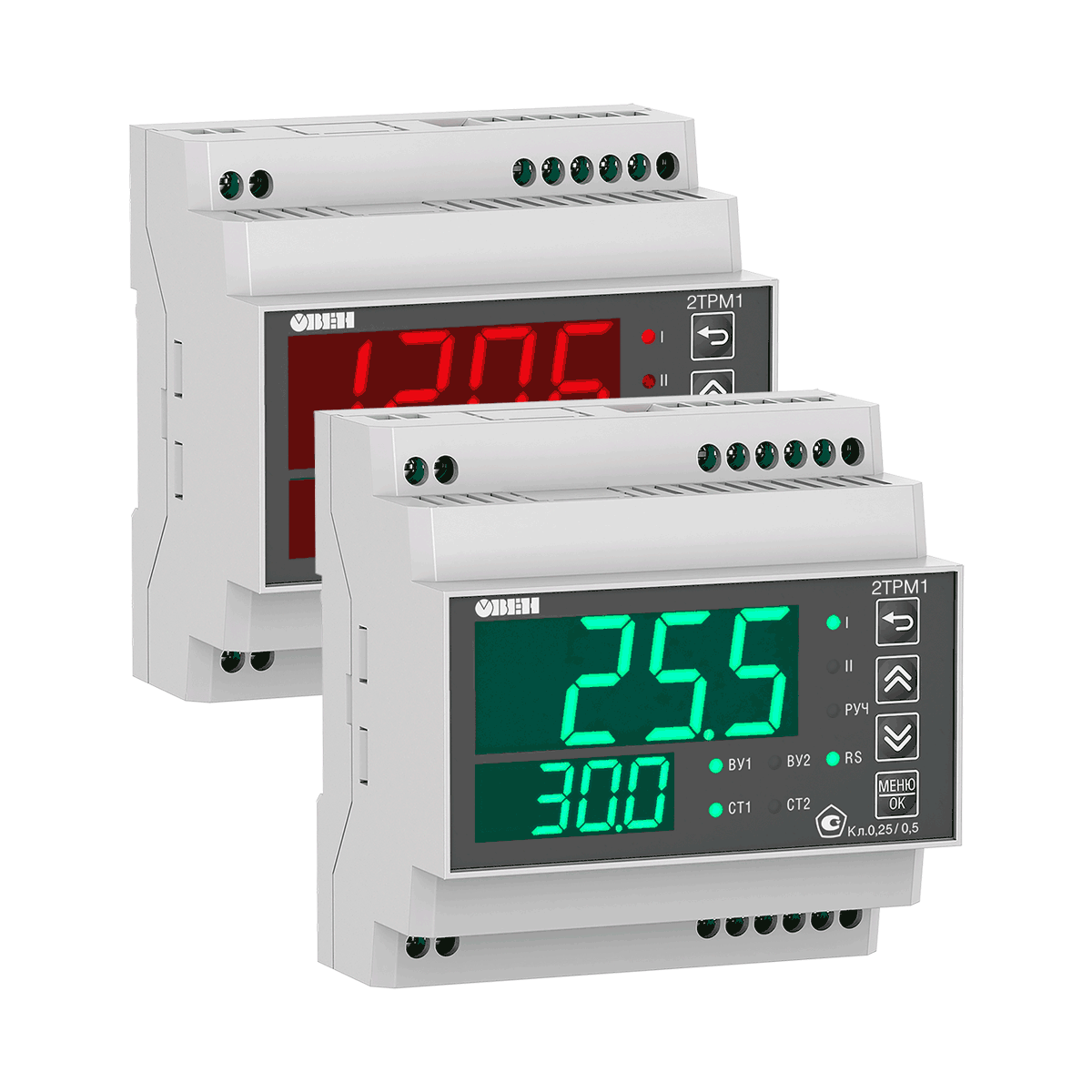 2ТРМ1 – двухканальный цифровой терморегулятор, предназначенный для измерения, регистрации или автоматического регулирования температуры, а также других физических величин (давление, влажность, уровень, расход и т.д.). Отличительной особенностью прибора является наличие двух независимых каналов управления. Прибор осуществляет как независимое управление по двум каналам, так и совместную работу каналов в задачах регулирования и сигнализации. Наличие второго входа позволяет выполнять регулирование по двум величинам с вычислением среднего значения или разницы показаний входов. Двухканальный терморегулятор 2ТРМ1 работает с разными типами датчиков что позволяет одним прибором контролировать две физические величины, например температуру и давление, температуру и влажность, давление и уровень. Наличие RS-485 позволяет выводить все измеряемые и настраиваемые параметры прибора в сеть диспетчеризации предприятия.