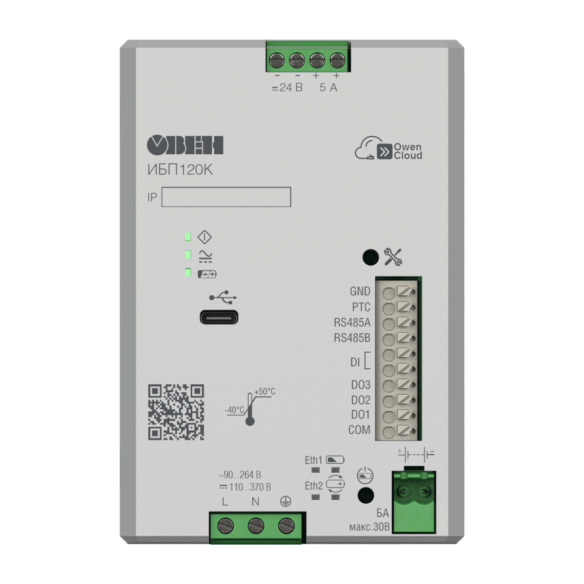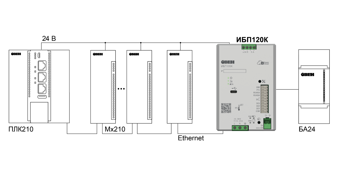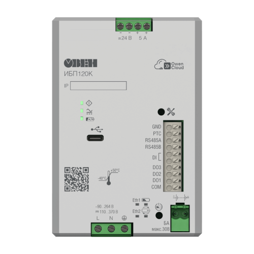 ОВЕН ИБП120К – источник питания с резервированием для питания стабилизированным выходным напряжением 24 В приборов промышленной автоматики в распределенных системах управления.