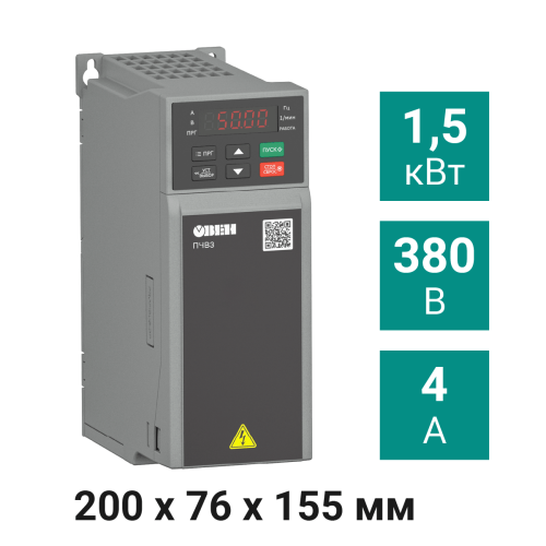 Преобразователь частоты ПЧВ3-1К5-В [М01] предназначен для управления электродвигателями мощностью 1,5 кВт. Номинальный выходной ток – 4,0 А, использует трехфазный источник питания переменного напряжения 380 В.