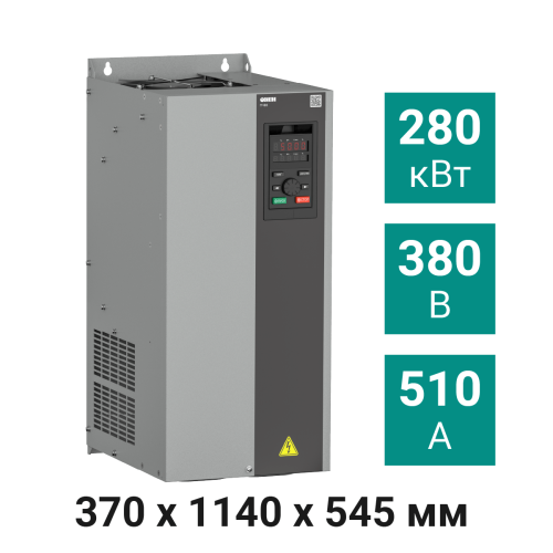 Преобразователь частоты ПЧВ3-280К-В [М01] предназначен для управления электродвигателями мощностью 280,0 кВт. Номинальный выходной ток – 510,0 А, использует трехфазный источник питания переменного напряжения 380 В.