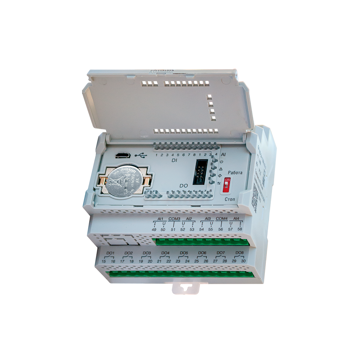 Прибор изготавливается в автоматном корпусе 5 DIN. Имеет на борту аналоговые и дискретные входы, а также дискретные выходы. Для управления устройствами по сети или передачи данных на верхний уровень в приборе предусмотрен интерфейс RS-485.
