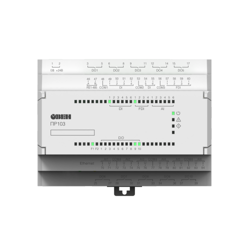 ПР103 – это первое программируемое реле ОВЕН с Ethernet на борту. Предназначено для управления вентиляцией, отоплением, насосными группами и другим оборудованием. Наличие интерфейса Ethernet позволяет интегрировать прибор в распределенные системы, реализовать удаленный контроль и управление оборудованием с помощью сервиса OwenCloud. В ПР103 может быть до 2-х интерфейсов RS-485 на борту для передачи данных на верхний уровень.